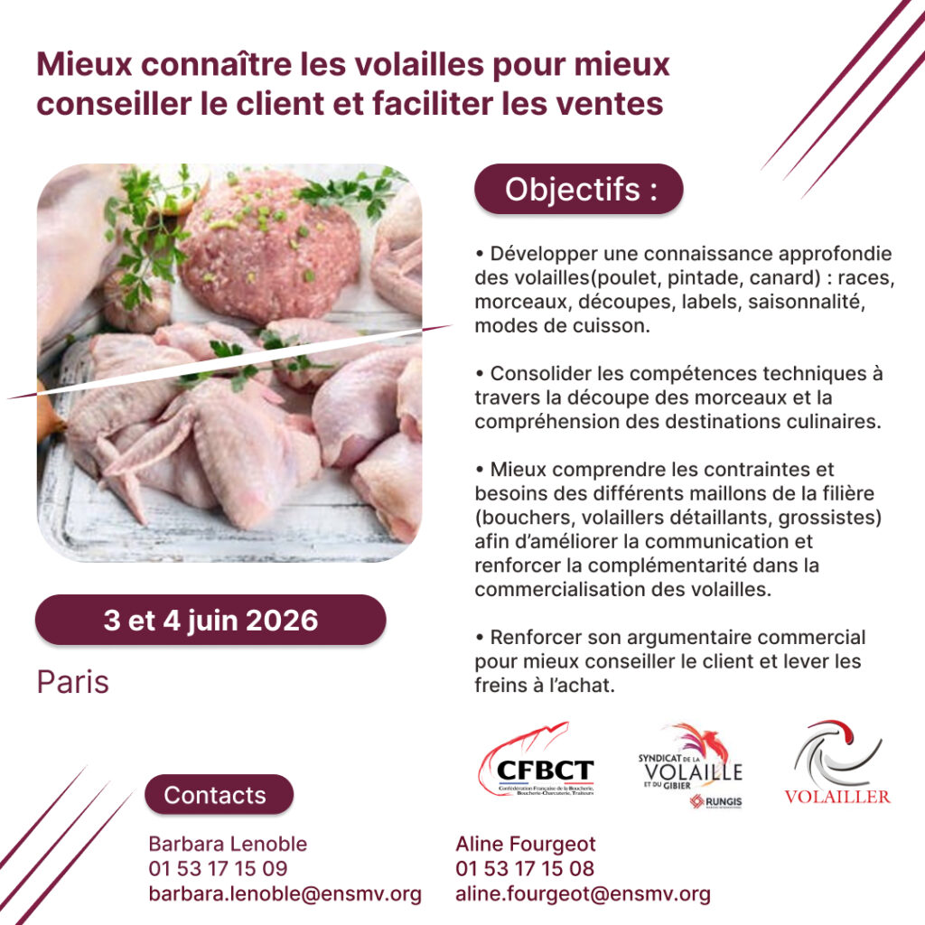 En collaboration avec la Confédération Française de la Boucherie, Boucherie-Charcuterie, Traiteurs, le Syndicat National des Volaillers Détaillants et le Syndicat de la Volaille et du gibier de Rungis, l’ENSMV met en place une nouvelle formation les mercredi 3 et jeudi 4 juin 2026.